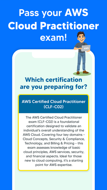 قم بالتحضير لامتحان ممارس السحابة AWS الخاص بك باستخدام تطبيق AWS Cloud Practitioner: 2024. يتضمن أكثر من 2,500 سؤالًا مكتوبة من قبل خبراء، وشروحات مفصلة، ومئات الاختبارات والاختبارات التفاعلية، تم تصميم هذا التطبيق لزيادة فرصك في اجتياز الامتحان الحقيقي في المحاولة الأولى. منظمة حسب الموضوع، يغطي مفاهيم السحابة، والأمان والامتثال، والتكنولوجيا، والفوترة والتسعير بشمول.